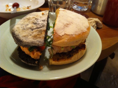 Sem filas, sem esperas... Na foto um "mix" pedimos dois "burguers" diferentes - um de camarão e um de salmão em bolo de caco de alfarroba e foi metade para cada um. O espaço é giro, a música é óptima, os pregos/hamburgueres são DELICIOSOS... as batatas fritas... uma desilusão!